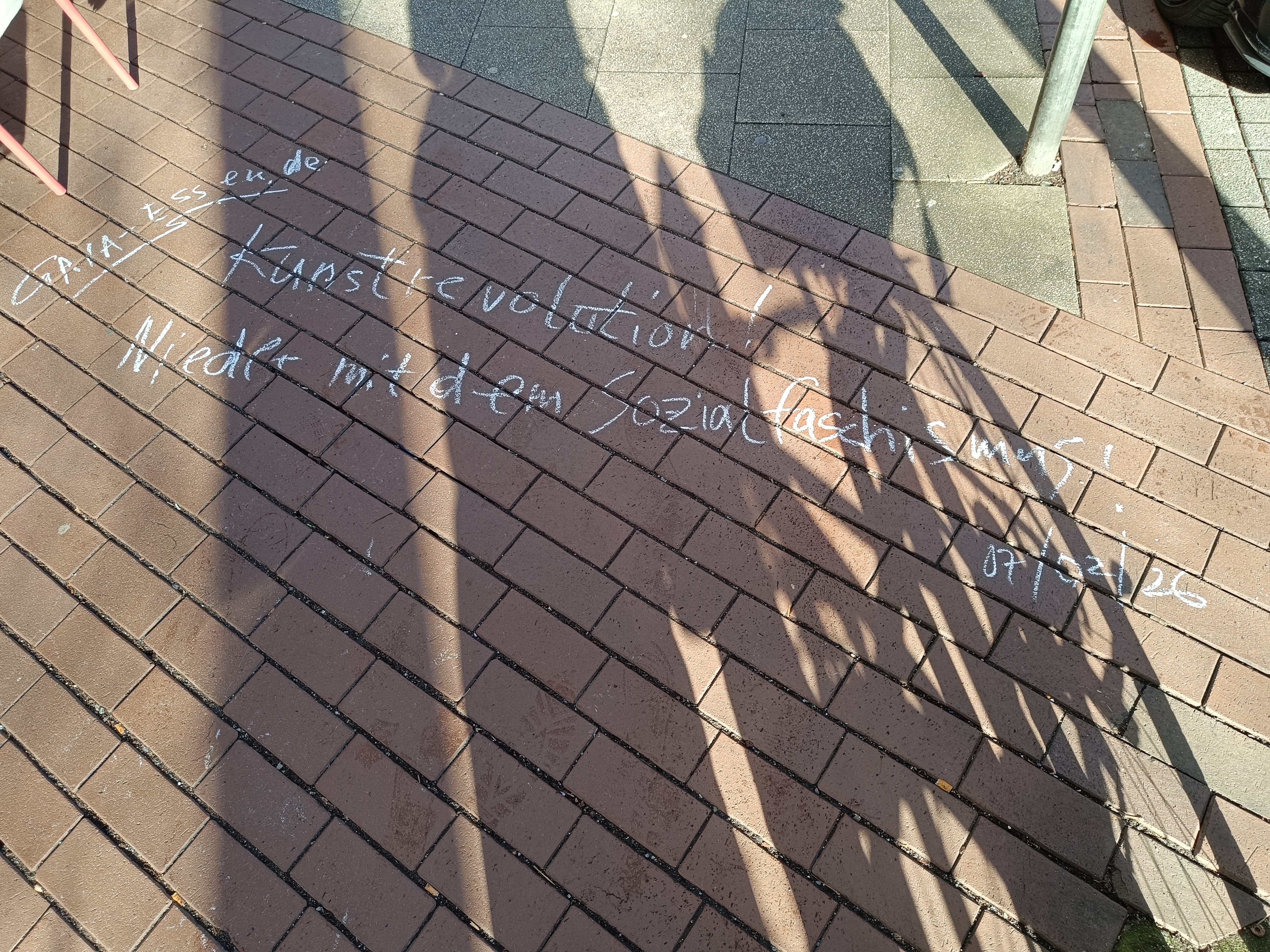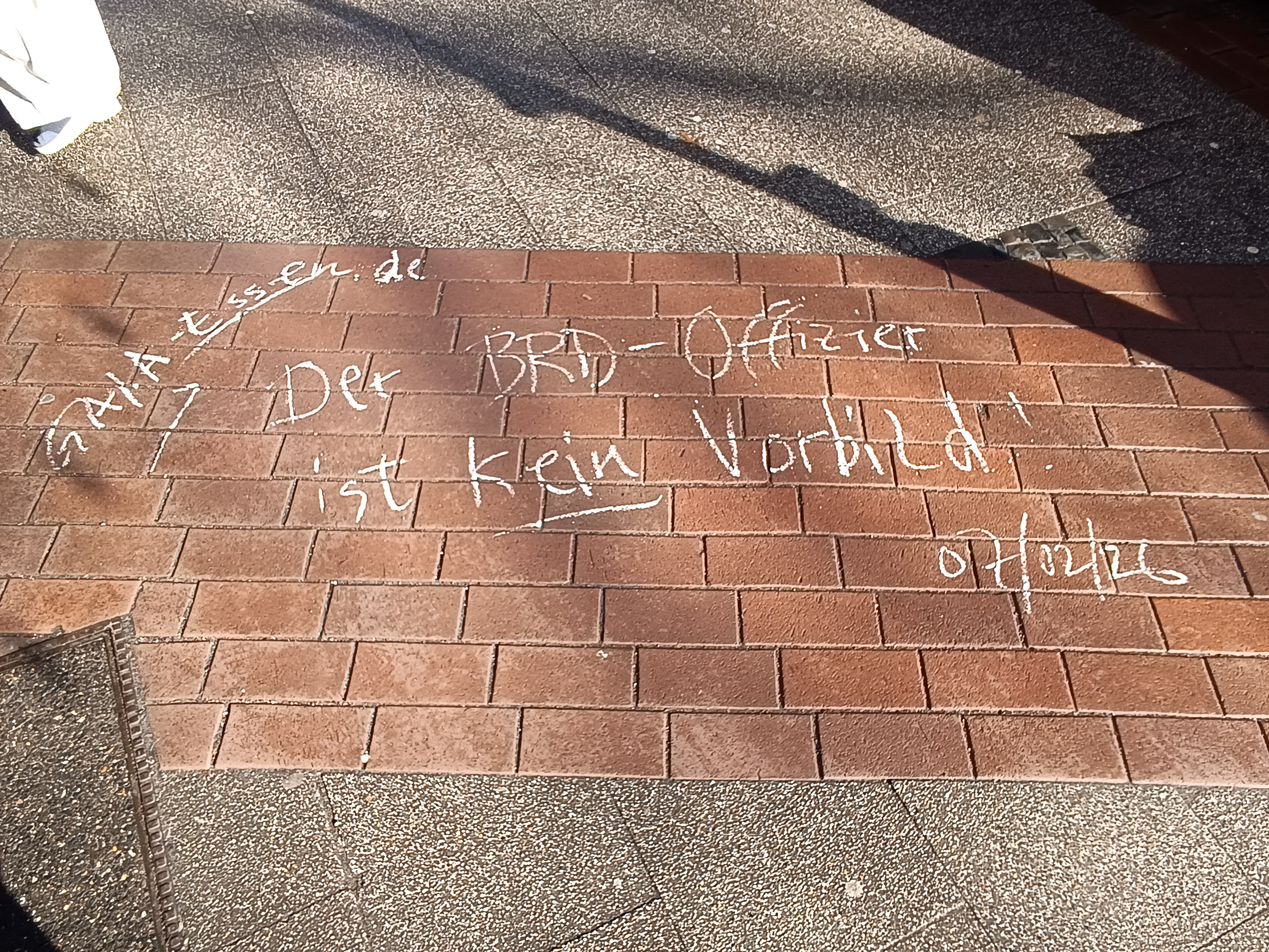Ich skandierte die Parolen ‘Der BRD-Offizier ist kein Vorbild’, gefolgt von ‘Nieder mit dem Sozialfaschismus, Nieder mit dem oligarchischen Terrorsystem’ und ‘Deutschland ist das Armenhaus in Europa’! Diese kurzen Texteinheiten wurden parallel dazu auch auf dem Bürgersteig schriftlich fixiert! Wieder konnte ich zwei intensive Gespräche über mein Vorhaben führen, wobei ich auch heute feststellen musste, dass diese immer noch nicht die übersinnliche Qualität erreicht haben, die wünschenswert ist, erkennbar an dem nur zaghaft sich zeigenden Gemeinschaftsgeist!” (wird fortgesetzt)